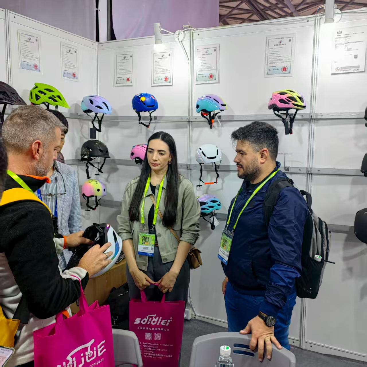 2025年5月5日,在上海新國際博覽中心N1-115展位,國外客商在“2025中國國際自行車展”上與自行車頭盔生產(chǎn)廠家洽談。